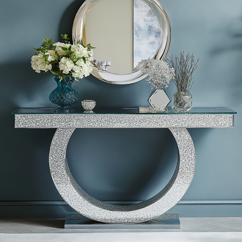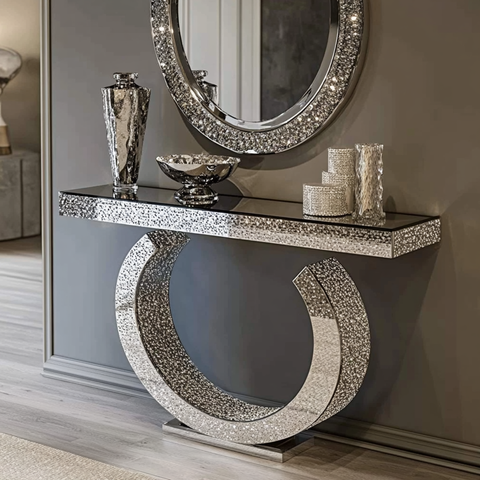 Zarif ekose yarı daire cam konsol masa sıcak satış yüksek kalite gümüş Sparkle aynalı elmas koridor masa oturma odası